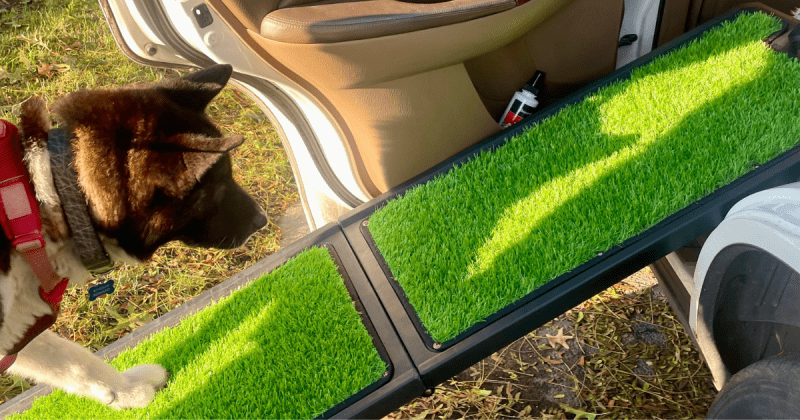 I searched for a dog ramp for my Akita due to her health issues and aging so she could be more mobile when traveling with me. I chose the Gen7Pets Natural Step Ramp for Vehicles because it offers good traction with an Astroturf carpet (which my dog loves – she is enamored with fake grass for some reason) and the folding design that offers easy portability. There are different options for traction and color, but I highly recommend the green one as it has great traction with the fake grass.